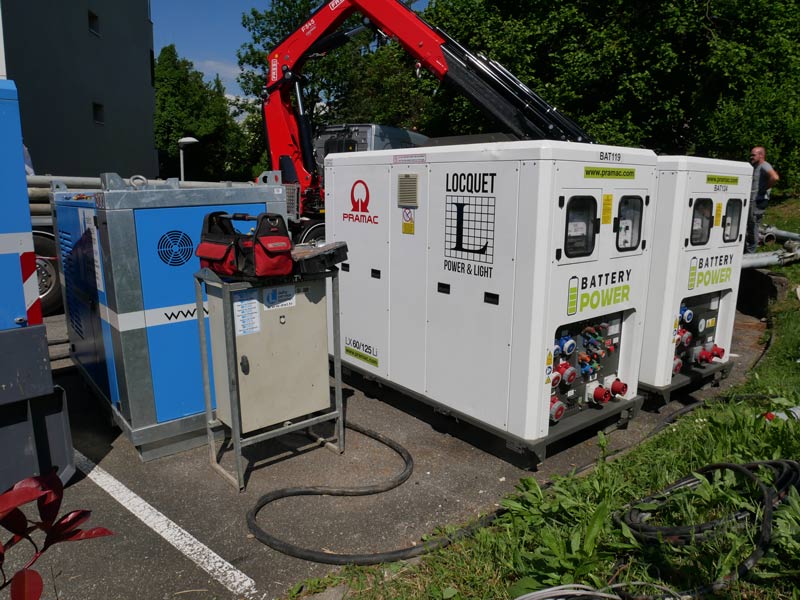 Alimentation électrique hybride, avec groupes électrogènes la journée et packs batteries la nuit.
